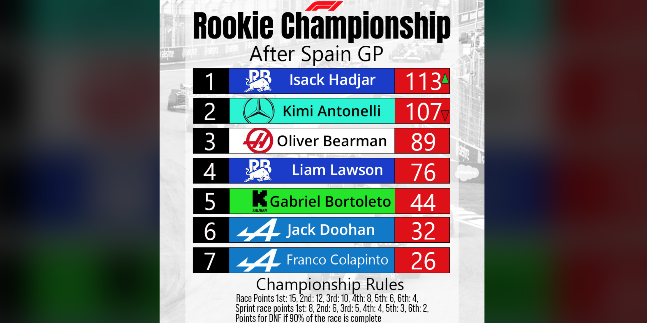“I redid the calculations here considering the rookie’s placement in relation to their teammate, using the following scoring system: 5 points for finishing ahead or qualifying ahead of the teammate in the main race; 2 points for finishing ahead or qualifying ahead of the teammate in the sprint. The table ended up as follows, not considering the points from race placement in the post table: Isack Hadjar – 74 points, Gabriel Bortoleto – 39 points, Oliver Bearman – 34 points, Jack Doohan – 17 points, Kimi Antonelli – 7 points, Liam Lawson / Franco Colapinto – 5 points”